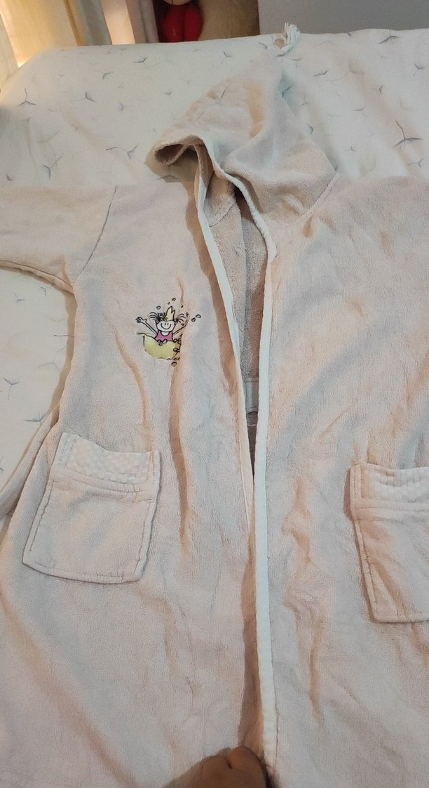 Kapüşonlu, yumuşak ve sıcak kumaştan yapılmış bej kız çocuk bornozu, baskılı detaylar ve ön cepler içerir. Rahat ve konforludur. (soley marka ) 6 7 yaşlarında giydik kolları kizim büyüdüğü için satışta arınma yapıyoruz