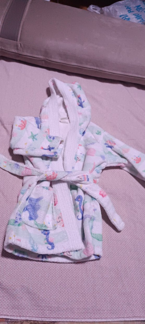 Kapüşonlu, bağcıklı ve uzun kollu, pastel tonlarda beyaz renkli yumuşak ve sıcak kız çocuk bornozu. 6 aydan 24 aya kadar kullanılabilir temiz ve defosuzdur.