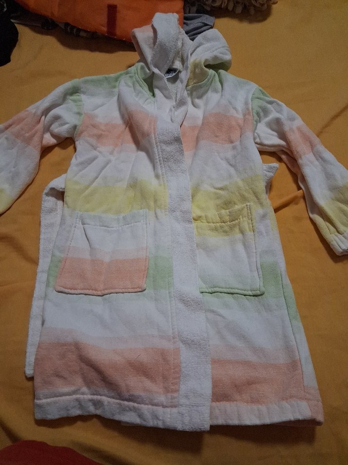 Kız çocuk bornozu, pastel batik desenli ve yumuşak, sıcak dokulu kumaştan yapılmıştır. Kapüşon ve ön cepler içerir. Banyo sonrası rahatlık için uygundur. sıfırdır 5 6 7 yaş olr