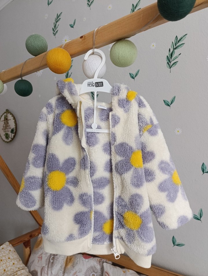 Kız çocukları için kapüşonlu, bol kesim ve yumuşak peluş detaylı ceket. Beyaz, sarı ve mor pastel tonlarda çiçek desenlidir, bohem sokak modası tarzında.