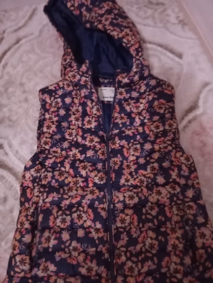 Kız çocukları için kapüşonlu, fermuarlı, çiçek desenli koyu renkli yelek. Sentetik kumaştan, dar kesim ve sokak tarzında, askısız yakalı.
