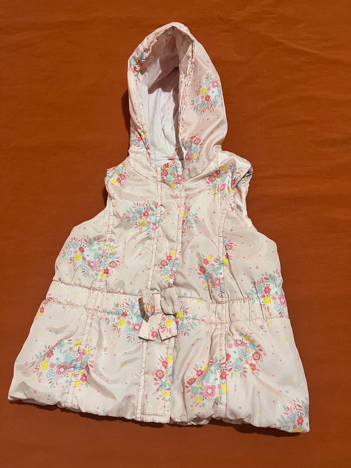 Kız çocukları için kapüşonlu, fermuarlı ön kısım ve çiçek desenli yumuşak sentetik kumaştan yapılmış kolsuz yelek. Bohem tarzına uygun dar kesim.