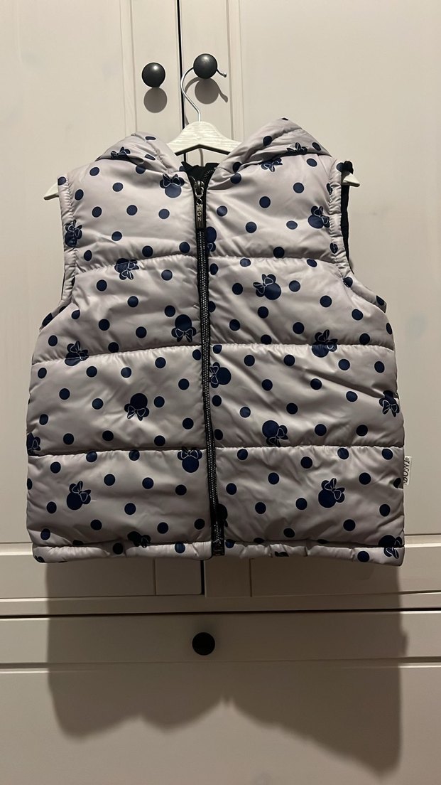 Düğmeli, baskılı desenli, kapüşonlu ve kolu olmayan gri yelek. Sokak tarzı için uygun, vücuda oturan kesim.