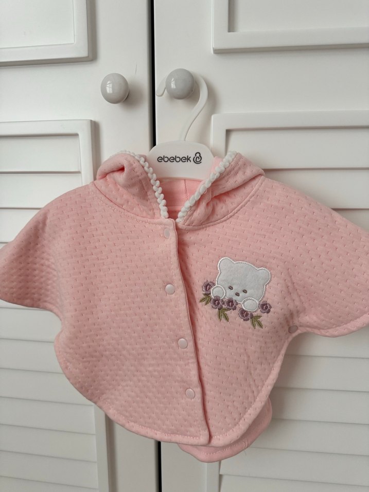 Kız çocukları için pembe kapüşonlu, kısa kollu, düğmeli ve bol kesim yumuşak ve sıcak kumaştan yapılmış panço. Nakışlı ayı deseni bulunur.