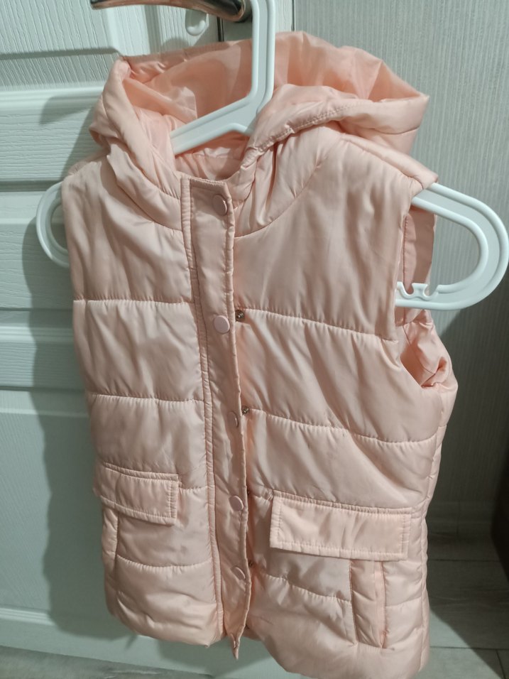 Kız çocukları için kapüşonlu, düğmeli ve pembe renkte olan bu yelek, straplez yakalı ve vücuda oturan kesimdedir. Yumuşak sentetik kumaştan üretilmiştir ve ön cebi vardır.