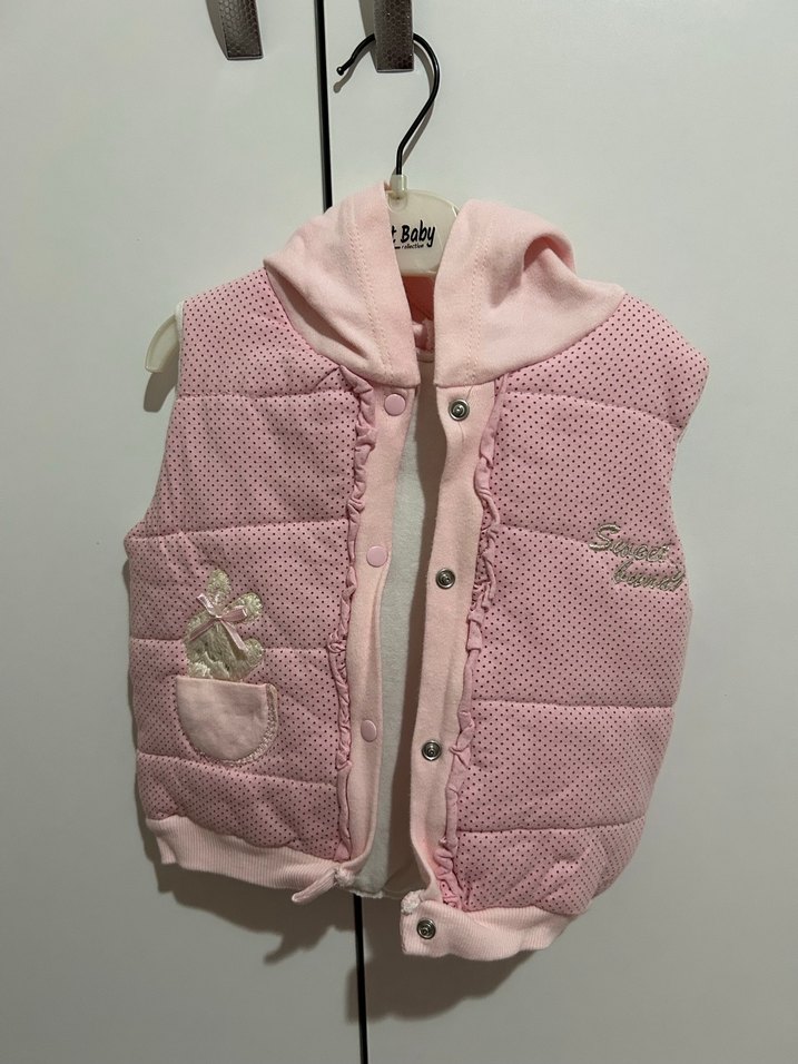 Kapüşonlu, düğmeli, nakış detaylı, yumuşak ve sıcak kumaştan yapılmış pembe kız çocuk yeleği. Trendy casual tarz için uygun. 1-2 yaşa olur diye düşünüyorum