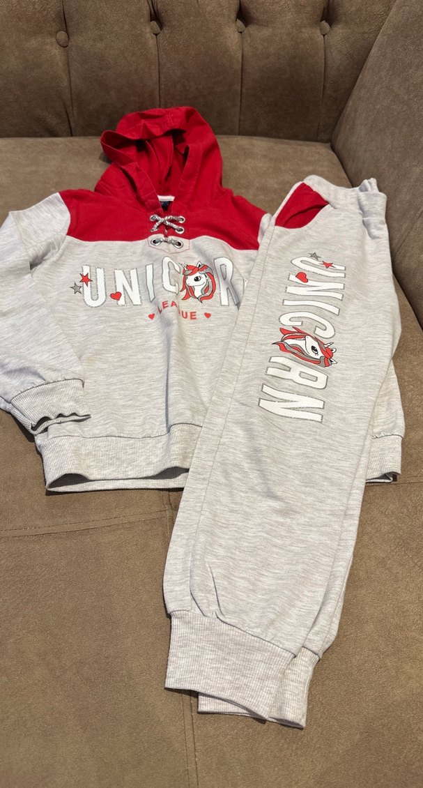 Uzun kollu, kapüşonlu ve ince kesim kız çocuk sweatshirtü, yumuşak ve sıcak kumaştan üretilmiştir. Üst kısmı kırmızı, önünde bağcıklı detay ve unicorn baskısı vardır. Alt üst takımdır. Yeni gibidir hiçbir kusuru yoktur .