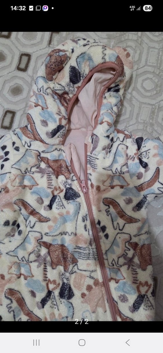 Kız çocuk kapüşonlu, fermuarlı, pastel tonlarda dinozor baskılı, yumuşak ve sıcak kumaştan yapılmış tulum.oldukça kalındır.mont kıvamında temiz defosuz ve lekesiz