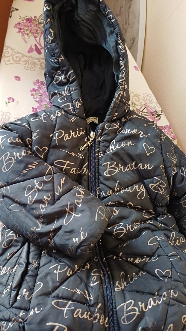Kız çocukları için kapüşonlu, fermuarlı ve baskılı desenli gri mont. Yumuşak ve sıcak dokuda fleece kumaştan üretilmiştir. Sokak stili için uygun.