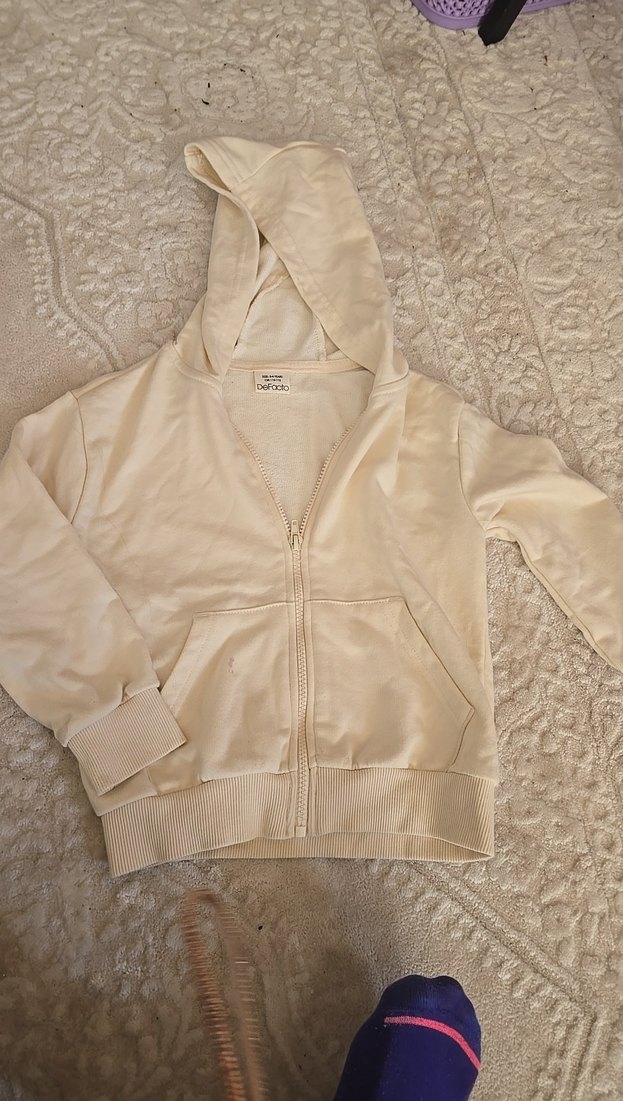 Kız çocukları için kapüşonlu ve fermuarlı, yumuşak ve sıcak kumaştan bej renkli dar kesim ceket. Düz ve desensiz, sokak tarzına uygun. defaatle 5-6 yaş