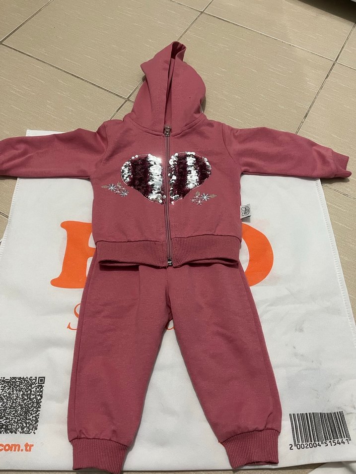 Koyu pembe renkli, kapüşonlu ve fermuarlı kız çocuk eşofman takımı. Yumuşak ve sıcak kumaştan, baskılı kalp deseniyle trend bir tarz sunar.
