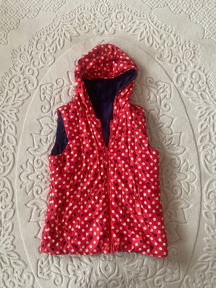 Kız çocukları için kapüşonlu, fermuarlı kırmızı yelek. Renkli puantiyeli desen ve vücuda oturan kesime sahip. Yumuşak ve sıcak kumaştan üretilmiştir.