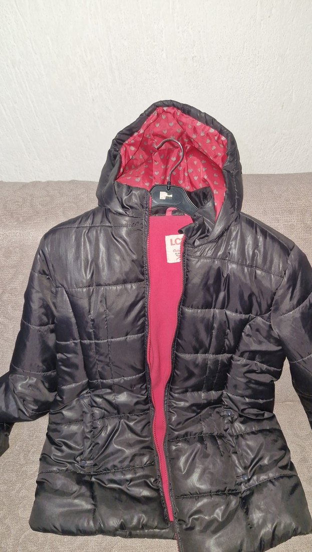 Fermuarlı, kapüşonlu ve kesimli kız çocuk ceketi. Dış yüzeyi koyu gri, iç kısmı desenli pembe yumuşak ve sıcak kumaştan yapılmıştır. Trend sokak tarzına uygundur.