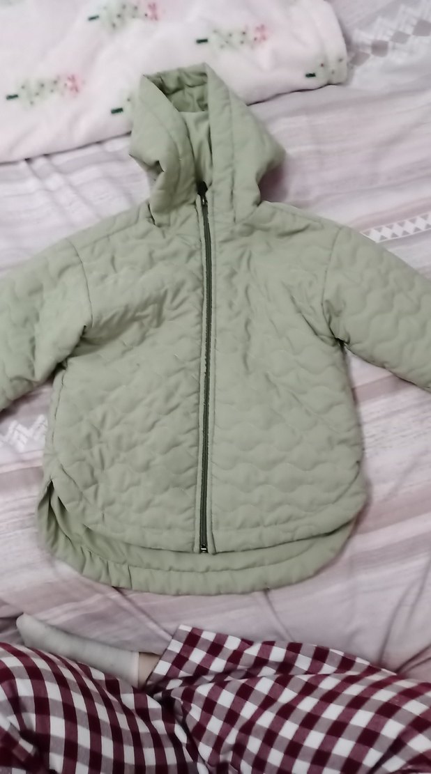 Bu kız çocuk montu, kapüşonlu ve ön fermuarlıdır. Yumuşak, sıcak kumaştan yapılmış olup pastel gri renktedir ve desensizdir.