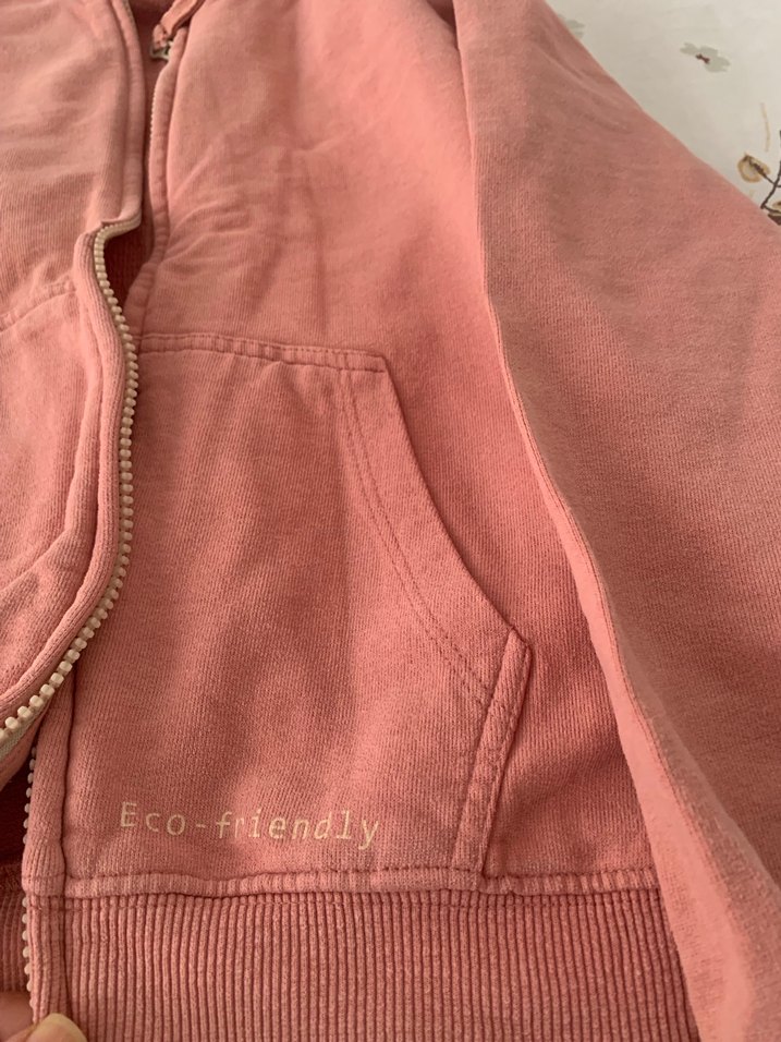 Fermuarlı ve kapüşonlu, pastel pembe renkte, yumuşak sentetik kumaştan yapılmış kız çocuk ceketi. Önde cepler ve çevre dostu etikete sahiptir.
