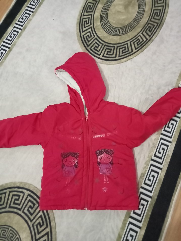 Kız çocukları için kapüşonlu, fermuarlı ve renkli baskılı detaylara sahip, pembe ve sıcak tutan kumaştan üretilmiş dar kesim mont.