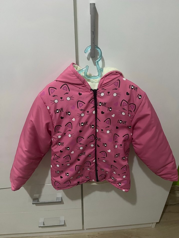 Renkli baskılı kedi desenli, kapüşonlu ve düğmeli, yumuşak ve sıcak kumaştan yapılmış pembe, trend sokak tarzı kız çocuk montu.