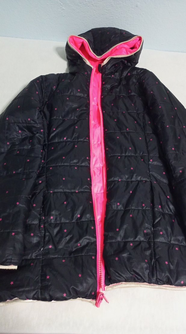 Kız çocukları için kapüşonlu, fermuarlı, notched lapel detaylı, sentetik kumaştan yapılmış, koyu pembe-siyah renkli, sokak stiline uygun mont.cift taraflı kullanılır