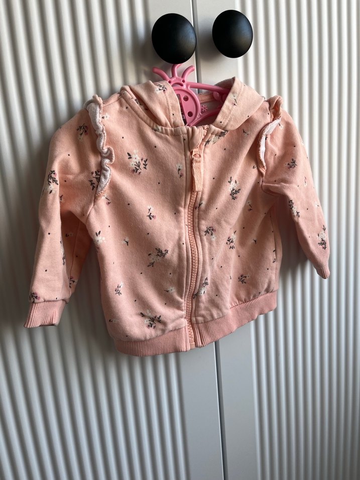 Fermuarlı, kapüşonlu ve uzun kollu, yumuşak kumaştan yapılmış pembe baskılı kız çocuk sweatshirtü. Sokak stiline uygun rahat kesim.