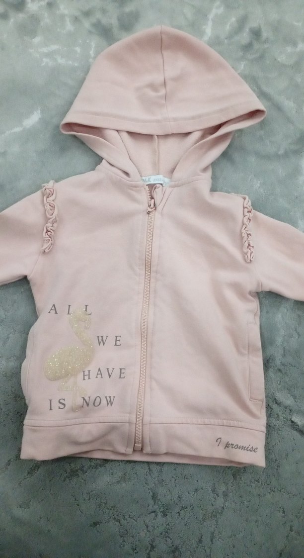 Kız çocukları için kapüşonlu, fermuarlı ve uzun kollu, yumuşak ve sıcak kumaştan yapılmış pembe sweatshirt. Üzerinde baskılı yazılar bulunur. Cepli.