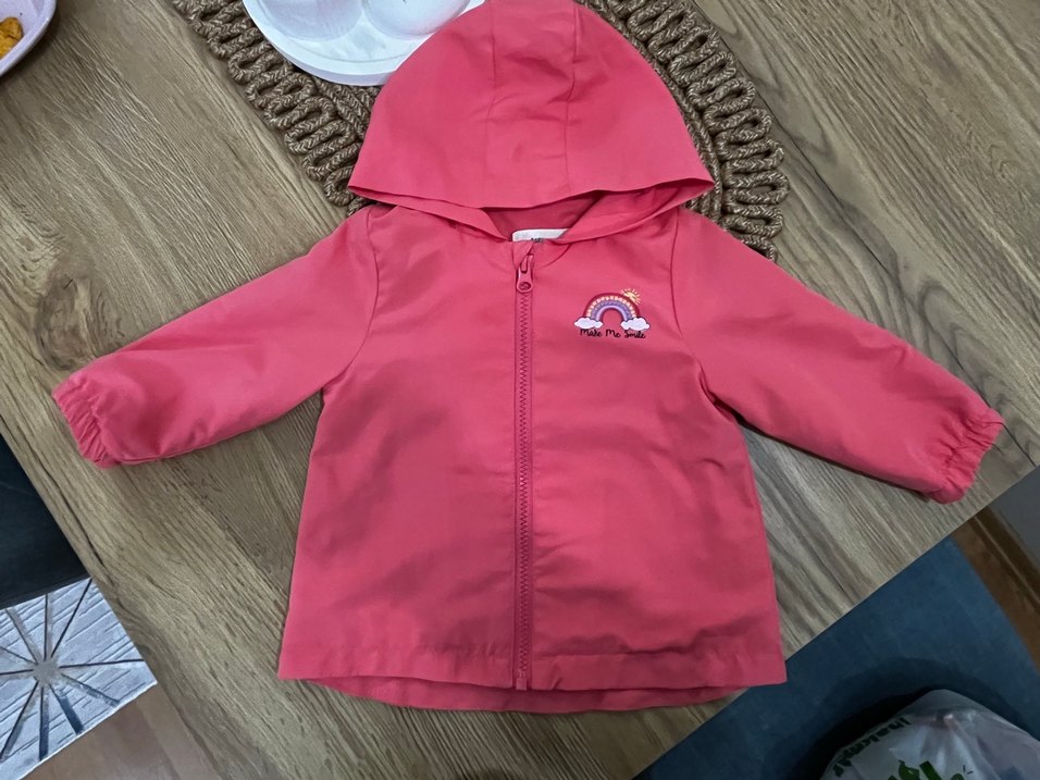 Kız çocuk için kapüşonlu, fermuarlı ve renkli baskılı, yumuşak ve sıcak kumaştan yapılmış pembe yağmurluk. Trend sokak stili için uygun.