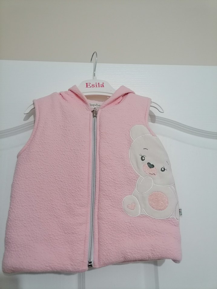 Kapüşonlu, fermuarlı ve yumuşak dokulu pembe kız çocuk yeleği, nakışlı ayı figürüyle sade ve rahat bir sokak stili sunar.