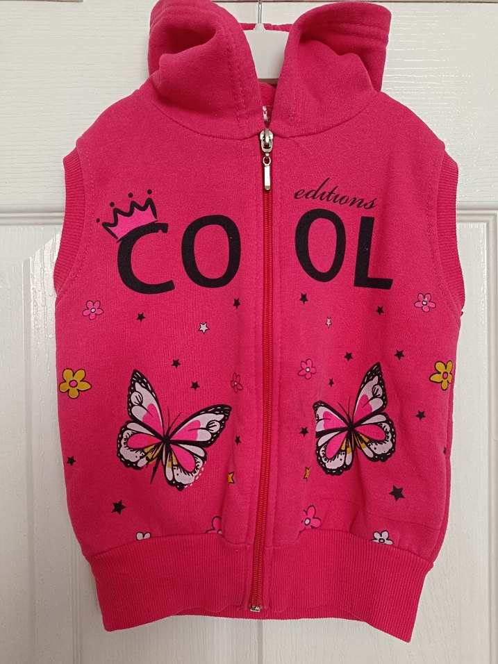 Kız çocukları için kapüşonlu ve fermuarlı, pembe renkli, yumuşak ve sıcak kumaştan yapılmış dar kesim yelek. Renkli kelebek ve çiçek baskılarıyla sokak stiline uygun.
