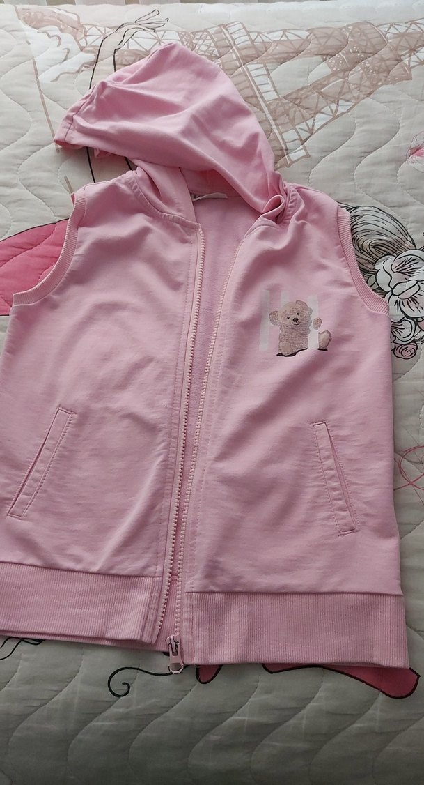 Kız çocukları için kapüşonlu ve fermuarlı, pastel pembe renkte, işlemeli detaylı, soft dokulu yelek. Rahat ve şık bir görünüm sunar.