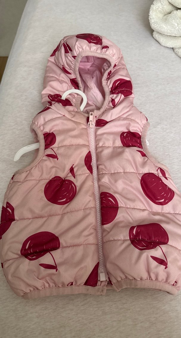 Kız çocukları için kapüşonlu, fermuarlı ve baskılı desene sahip pembe yelek. Yumuşak ve sıcak kumaşla rahat bir kullanım sunar.