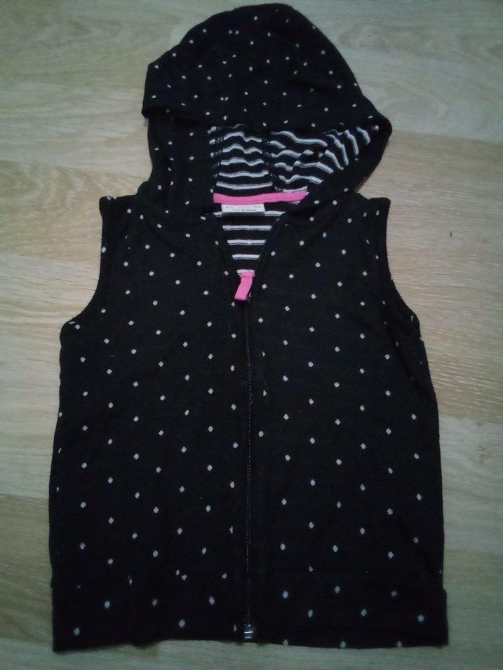 Kız çocukları için kapüşonlu, fermuarlı ve baskılı desenli siyah, kolsuz, vücuda oturan yelek. Rahat sokak stili için uygun yumuşak kumaş.