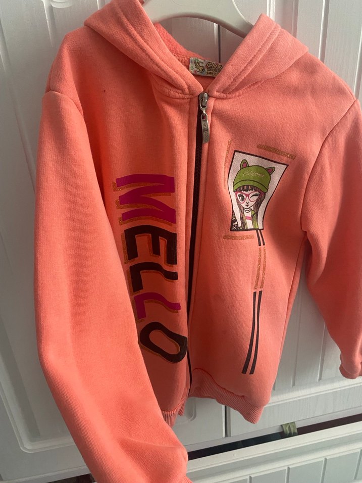 Pembe kapüşonlu, fermuarlı ve baskılı kız çocuk sweatshirtü. Uzun kollu, rahat kesim ve yumuşak, sıcak kumaştan üretilmiştir.