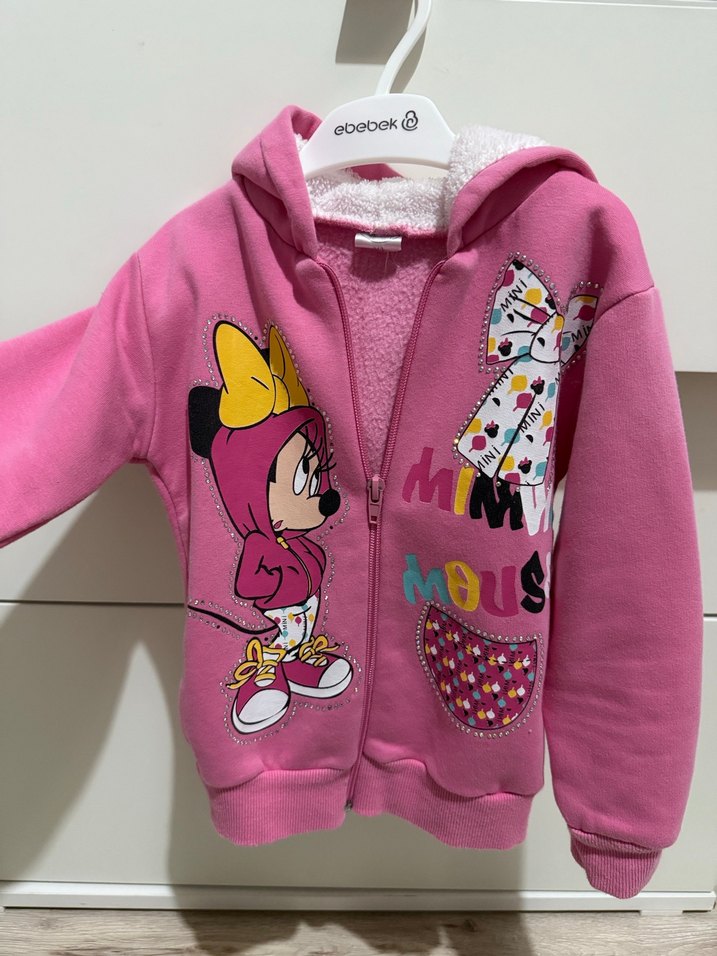 Kız çocuk kapüşonlu, fermuarlı sweatshirt. Uzun kollu, renkli Minnie Mouse baskılı, yumuşak ve sıcak kumaştan, rahat kesim.