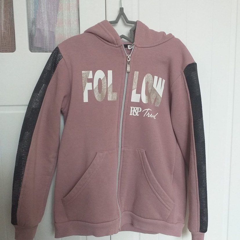Pembe renkli kız çocuk sweatshirt, bol kesim ve yuvarlak yaka ile. Uzun kollu, gri baskılı şerit detaylı ve ön fermuarlı. Önünde "FOLLOW" baskısı ve kanguru cepleri bulunur. Yumuşak tüylü kumaştan.