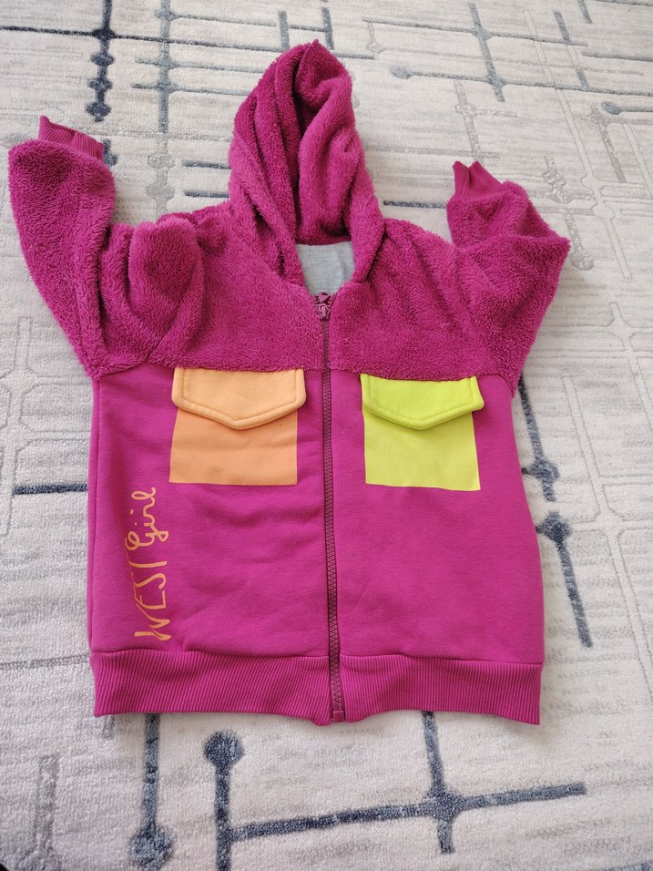 Kız çocuklar için kapüşonlu, fermuarlı ve uzun kollu sweatshirt. Yumuşak ve sıcak kumaştan üretilmiş, bol kesimdir. Canlı renklerde cep görünğmlü ve baskılar içerir.