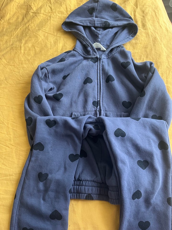 Yumuşak ve sıcak kumaştan, kapüşonlu ve fermuarlı, bol kesim kız çocuk sweatshirtü. Uzun kollu, mavi renkli ve siyah kalp desenlidir.