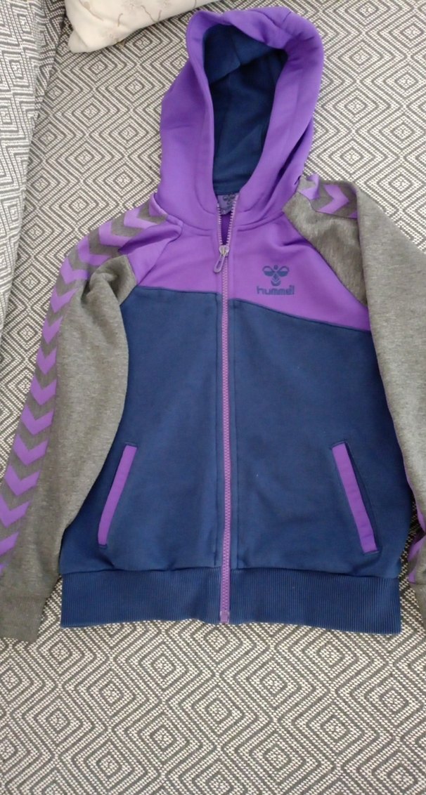 Kız çocuklar için kapüşonlu ve fermuarlı, mor, gri ve lacivert renklerde fit kesim sweatshirt. Kollarda baskılı desenler ve yumuşak, sıcak kumaş kullanılmış.