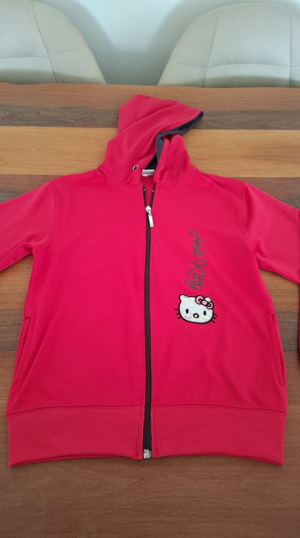 Kapüşonlu, fermuarlı ve uzun kollu pembe kız çocuk sweatshirtü, yumuşak ve sıcak kumaştan üretilmiştir. Renkli Hello Kitty baskısı ile dikkat çeker. cepli içi yumuşak kumaş