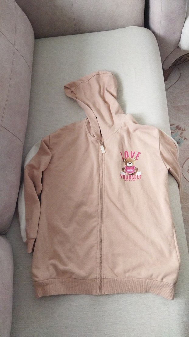 Bej kapüşonlu, fermuarlı, uzun kollu ve bol kesim sweatshirt. "LOVE YOURSELF" yazılı baskı ve yumuşak, sıcak kumaş kullanılmış.