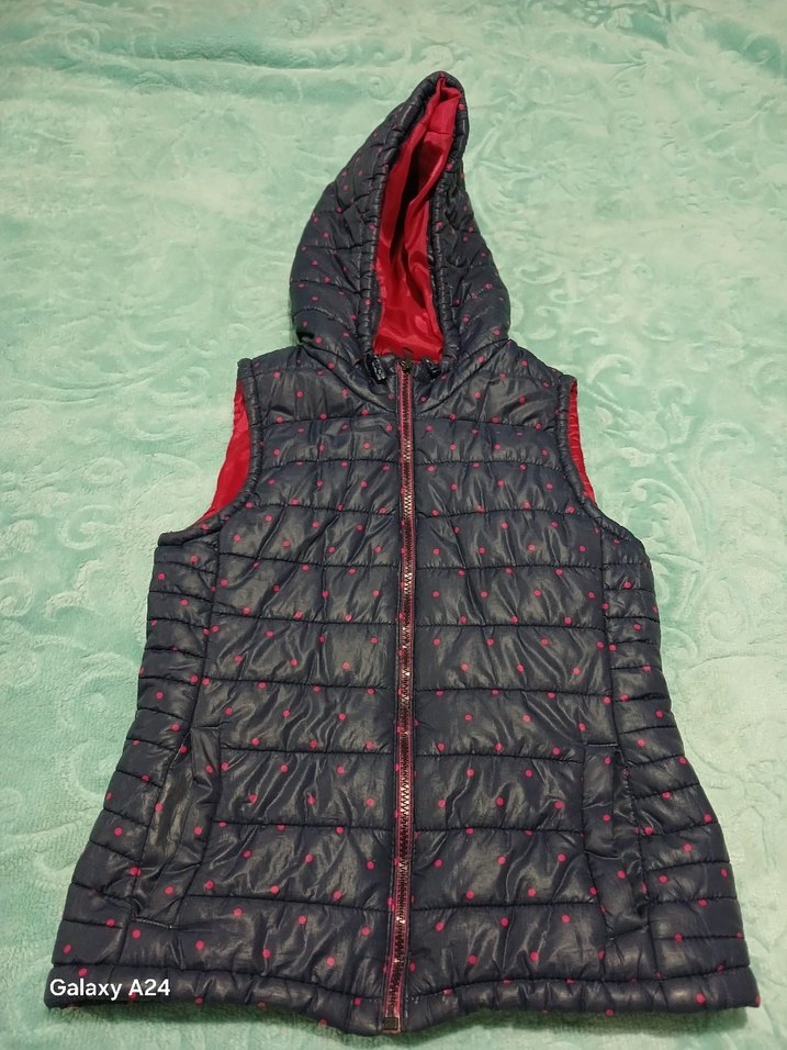Koyu gri renkte, kapüşonlu ve fermuarlı, sentetik kumaştan kız çocuk yeleği. Kolsuz ve dar kesim, sokak stili için uygun.