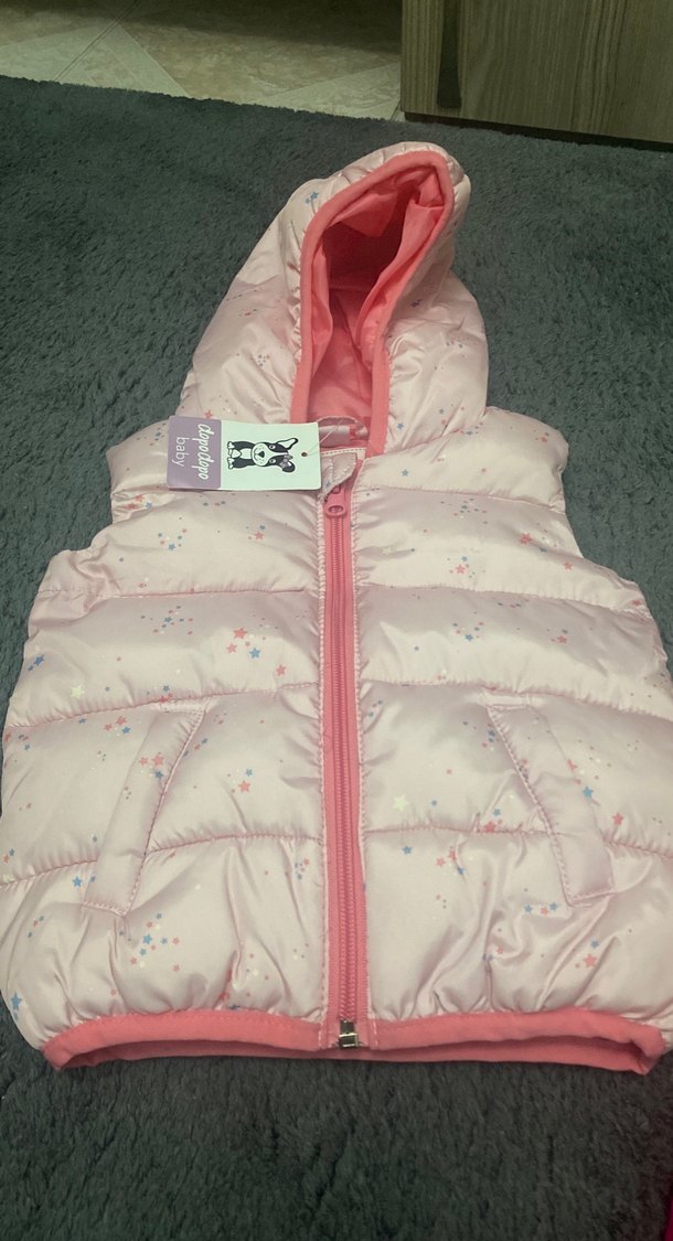 Pastel pembe kapüşonlu, fermuarlı ve baskılı yıldız desenli kız çocuk yeleği. Yumuşak ve sıcak kumaştan, fit kesimle rahat sokak stili için uygundur.