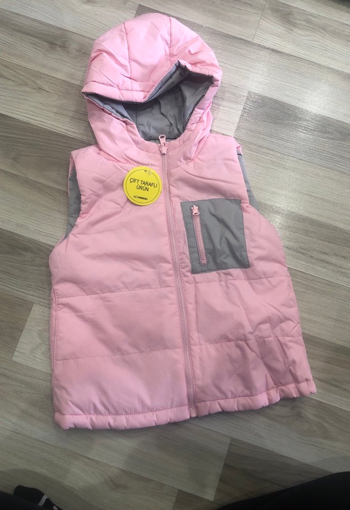 Pembe, kapüşonlu ve fermuarlı kız çocuk yeleği. Kolsuz, fitted kesim ve küçük göğüs cebi ile yumuşak ve sıcak kumaştan üretilmiştir.