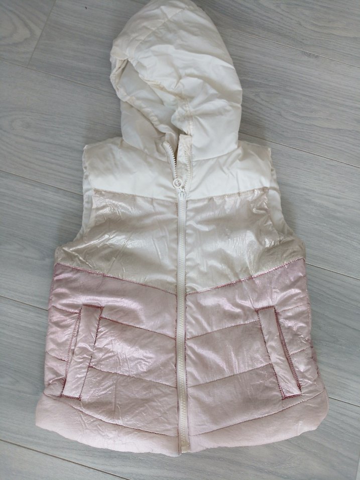 Kapüşonlu, fermuarlı ve kolsuz yelek, pastel beyaz ve pembe tonlarında,Aslında fazla kullanılmadı ama makineye attığım için renginde biraz solma oldu. Başka sorunu yok