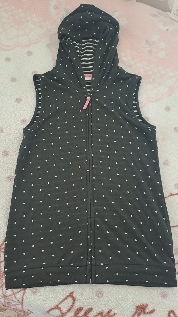 Kız çocuklar için kapüşonlu, fermuarlı ve yüksek yakalı dar kesim yelek. Siyah zemin üzerinde küçük beyaz noktalar bulunur, rahat ve sıcak kumaştan yapılmıştır.