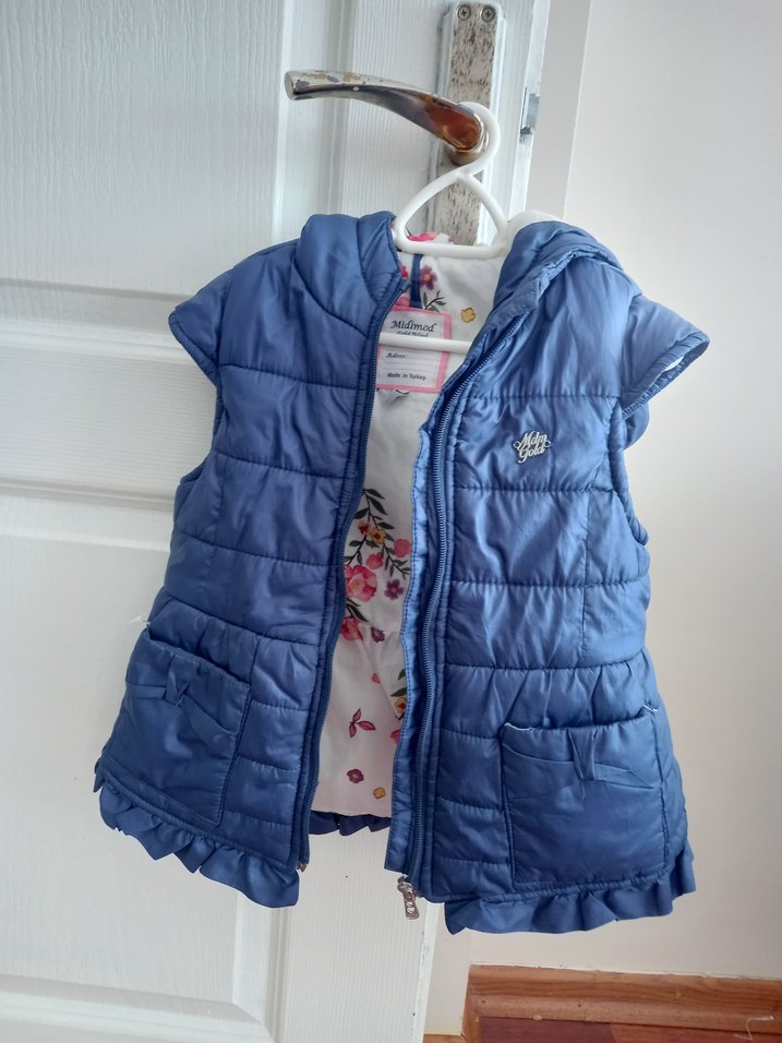 Mavi renkli kız çocuk yeleği, kapüşonlu ve fermuarlı. İki ön cepli, yumuşak dolgulu ve casual sokak stili için uygun.