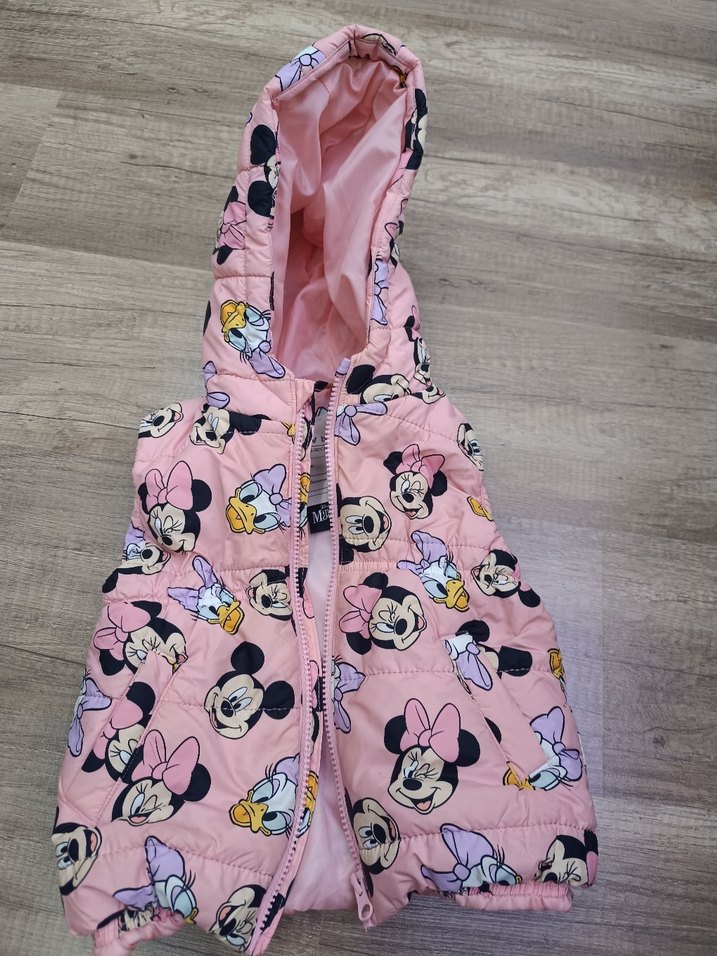 Kız çocukları için kapüşonlu, fermuarlı ve baskılı desenli pastel pembe renkli sentetik kumaştan yapılmış dar kesim yelek.