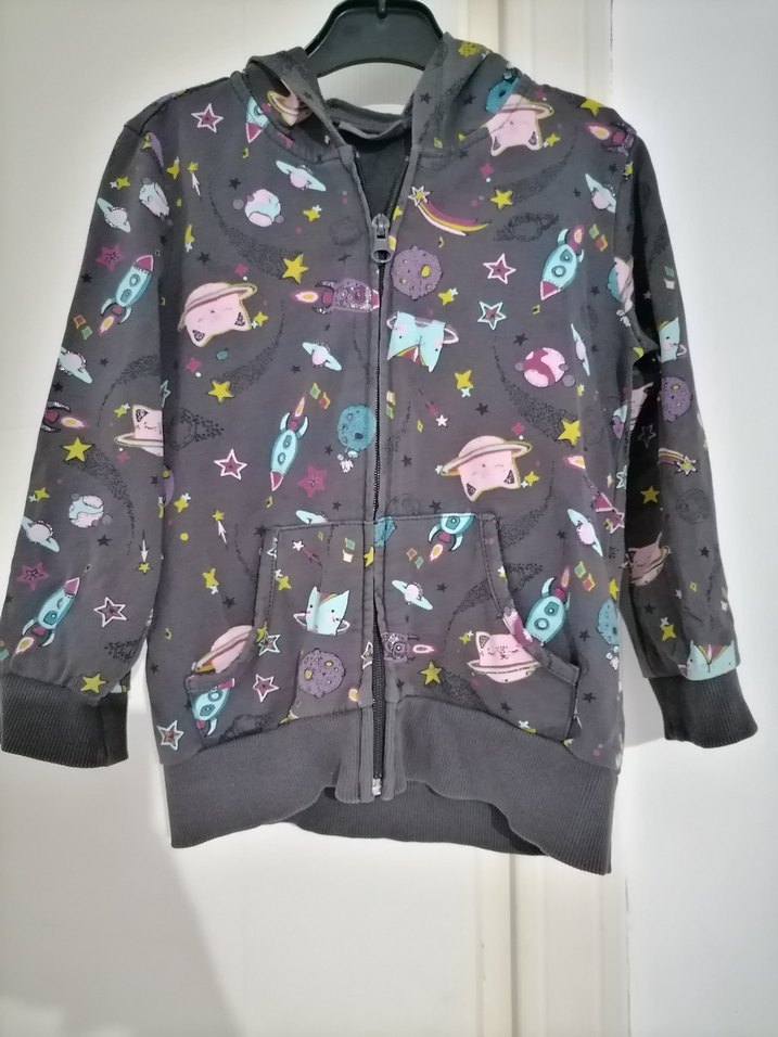 Kız çocukları için kapüşonlu, uzun kollu, fermuarlı sweatshirt. Yumuşak ve sıcak fleece kumaştan, bol kesim ve renkli uzay temalı baskılı.