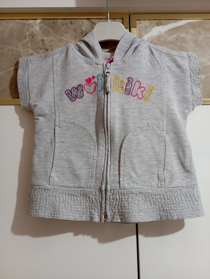 Kız çocukları için kapüşonlu, fermuarlı, gri renkli, nakış detaylı yelek. ön tarafında fotoğraf ta gösterdiğim gibi 3/4 yerde leke vardır. başka herhangi bir yerinde sorun yoktur.