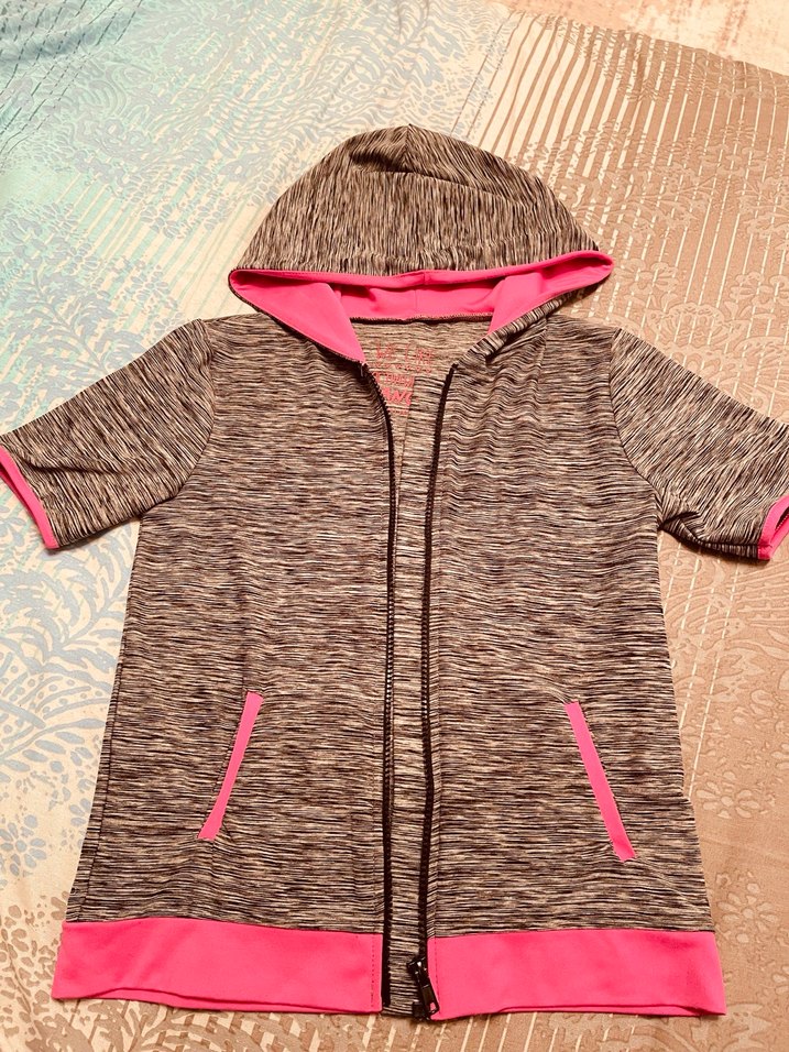 Bu kız çocuk ceket, kapüşonlu ve fermuarlı olup, yumuşak sentetik kumaştan üretilmiştir. Gri renkte olup kapüşon astarı, cep kenarları ve etek kısmında pembe detaylar bulunur.