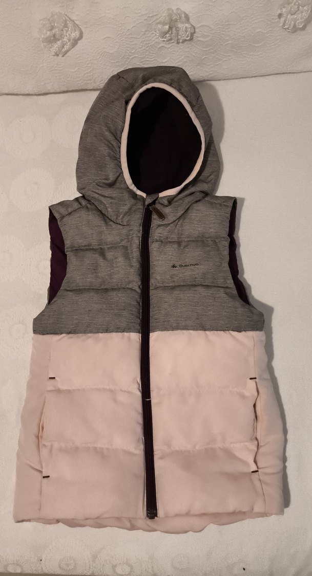 Kız çocukları için kapüşonlu, fermuarlı, yüksek yakalı, gri üst ve pembe dolgulu alt kısımlı, fitted kesim yelek. Rahat sokak stili için uygun.