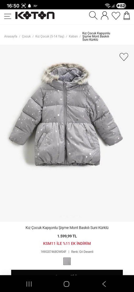 Kız çocuklar için kapüşonlu, suni kürklü detaylı gri şişme mont. Yumuşak ve sıcak kumaş, hafif yıldız desenli ❄️ Sıfır ürün fiyatı 1600₺, yeniden farksız kusursuz
